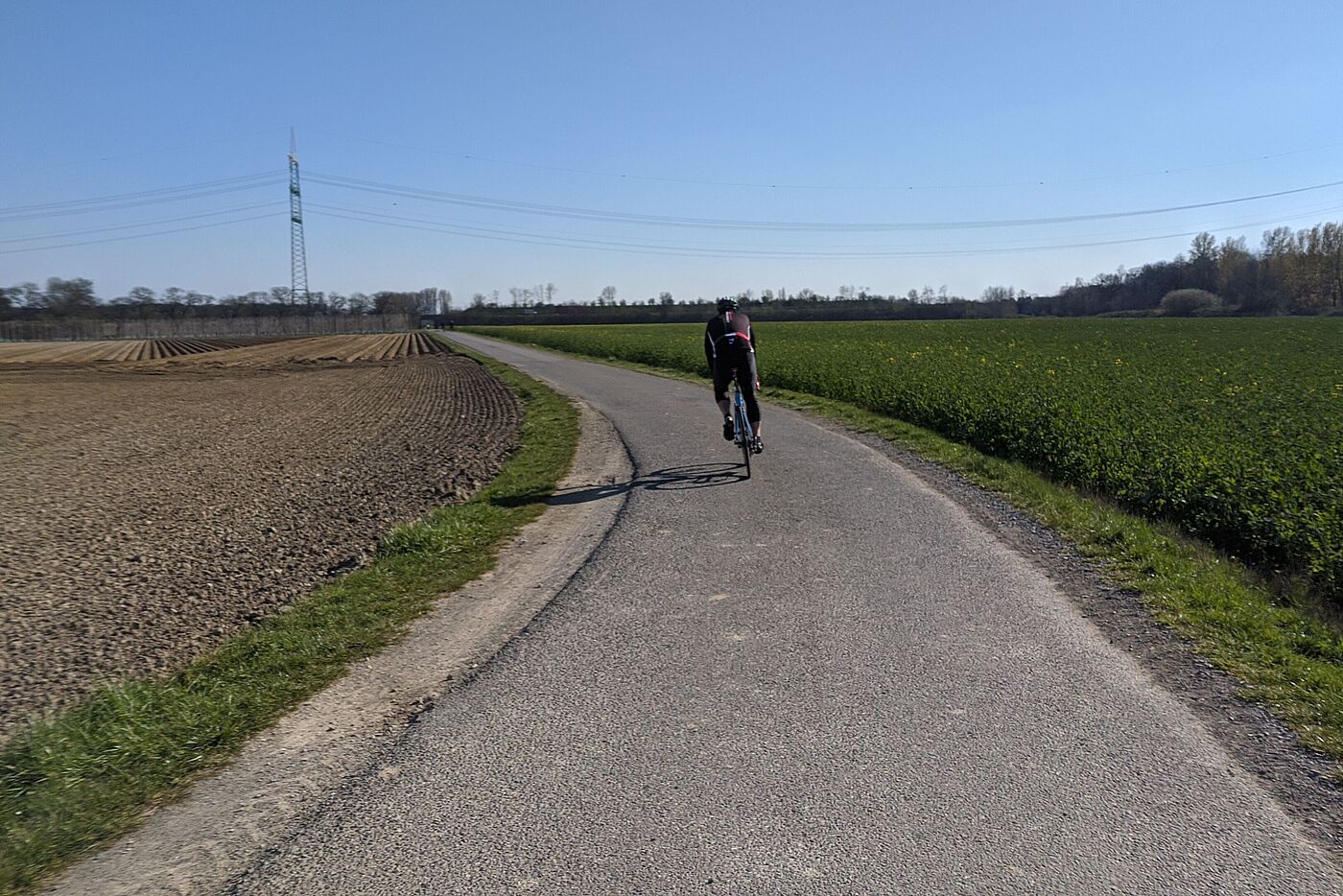 Außer dem kleinen Stück durch das Gewerbegebiet am Neusser Hafen radeln wir ausschließlich über verkehrsarme Straßen oder Wege ohne Autoverkehr.