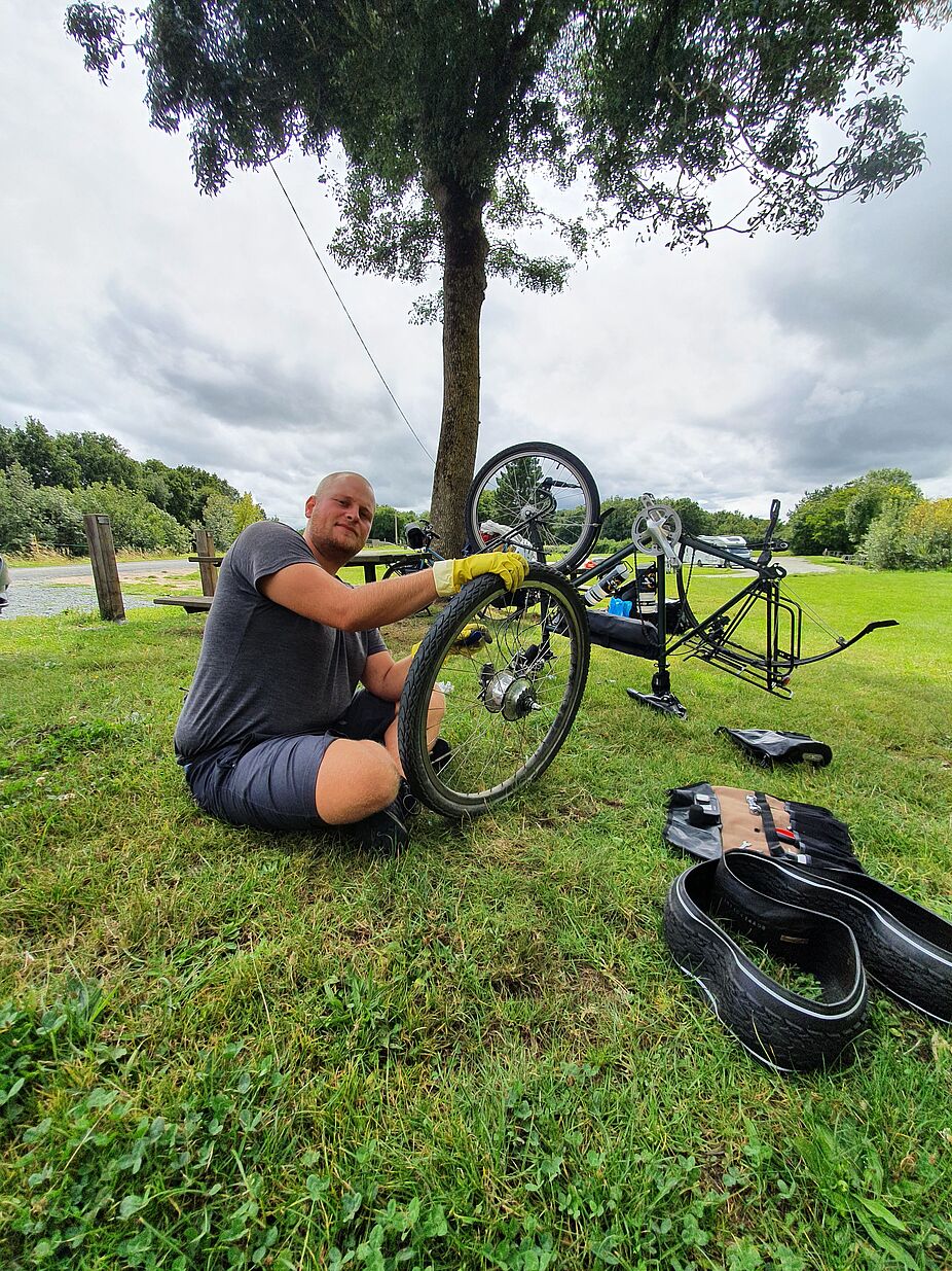 Wir haben Sie 2020 bei einem Reifen-Flickkurs beim ADFC Düsseldorf kennengelernt. Das im Kurs Gelernte konnten die Beiden auch schon erfolgreich bei der Tour anwenden.