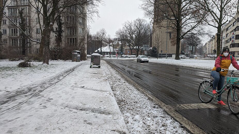 Der ADFC weist darauf hin, dass rein rechtlich Radfahrende auf die Fahrbahn ausweichen dürfen, wenn ein Radweg durch Schnee, Eis oder Laubmassen nicht befahrbar ist. "Eine echte Lösung stellt diese Regelung aber auch nicht dar", betont Lerke Tyra. Der ADFC weiß, dass die meisten Radfahrerinnen und Radfahrer wegen des oft rücksichtslosen Autoverkehrs nicht auf die Fahrbahn ausweichen wollen. Außerdem türmt sich oft auch am rechten Fahrbahnrand der Schnee.